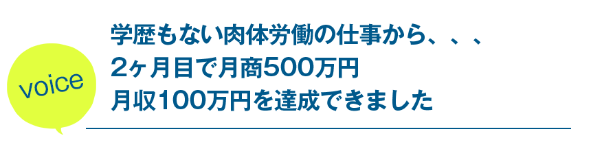一人一人の状況、個性に合わせた指導内容を実践してくださり、私の場合はコンサルを受けて1ヶ月で月利100万円を超えました。何と言っても結果の出るスピード感は体感してみた私が一番驚いています。